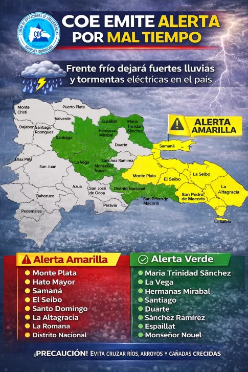 El Centro de Operaciones de Emergencias (COE) elevó los niveles de alerta en el país, colocando 08 provincias y el Distrito Nacional en alerta amarilla, mientras otras 08 permanecen en alerta verde, ante el avance de un sistema frontal que mantiene condiciones peligrosas sobre gran parte del territorio nacional.