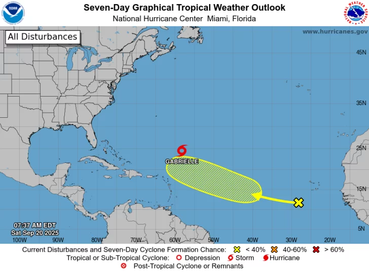 La tormenta tropical Gabrielle fue localizada a unos 855 kilómetros al noreste de Las Antillas Menores. Se mueve hacia el noroeste a unos 20 km/h. Sus vientos máximos sostenidos se mantienen en unos 85 km/h con ráfagas más fuertes en su entorno.