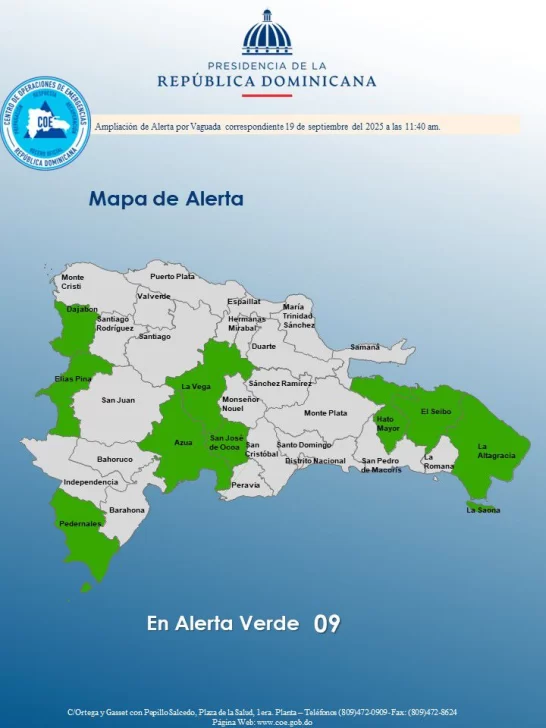 El COE aumenta 09 provincias en alerta verde, debido a que el informe del INDOMET, establece que, actualmente, ocurren chubascos dispersos, tormentas eléctricas aisladas y posibles ráfagas de viento por la humedad dejada por una onda tropical, más la inestabilidad provocada por una vaguada en distinto niveles de la tropósfera en adicción a los efectos locales de calentamiento diurno.
