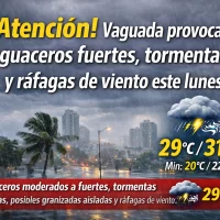Hoy miércoles, algunos chubascos matutinos se esperan hacia Duarte, Hermanas Mirabal, Samaná, la zona costera de La Altagracia, El Seibo, Hato Mayor y María Trinidad Sánchez, debido al arrastre del viento del este. En la tarde, estas precipitaciones ocurrirán también hacia Monte Plata, San Pedro de Macorís, el Gran Santo Domingo, San Cristóbal, Monseñor Nouel, Sánchez Ramírez, San José de Ocoa, La Vega, el norte de Azua, la zona montañosa de Peravia, San Juan y Elías Piña, en forma de aguaceros localmente moderados con tronadas aisladas y ráfagas de viento ocasionales que cesarán paulatinamente durante la noche.