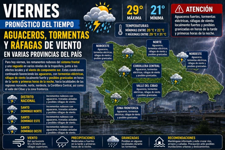 Para hoy viernes, los remanentes nubosos del sistema frontal y una vaguada en varios niveles de la troposfera, junto a los efectos locales y el viento de componente sur. Estas condiciones continuarán favoreciendo los aguaceros, con tormentas eléctricas, ráfagas de viento localmente fuerte y posibles granizadas en horas de la tarde y primeras horas de la noche, hacia localidades de las regiones noroeste, norte, nordeste, la Cordillera Central, así como el valle del Cibao y la zona fronteriza.