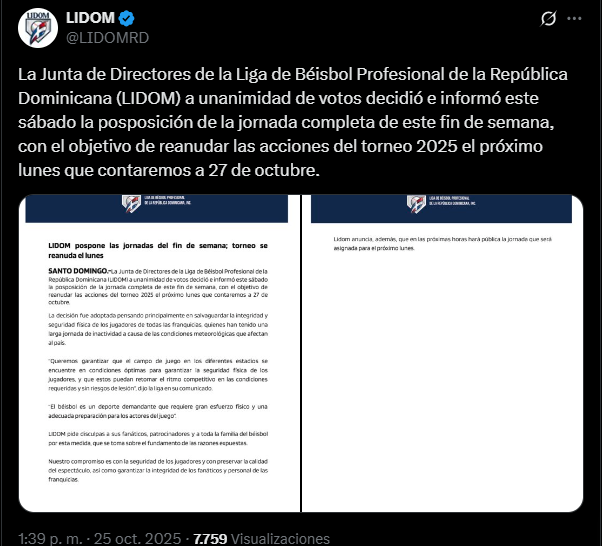Según la publicación en X, La Junta de Directores de la LIDOM a unanimidad de votos decidió e informó este sábado la posposición de la jornada completa de este fin de semana, con el objetivo de reanudar las acciones del torneo 2025 el próximo lunes que contaremos a 27 de octubre.