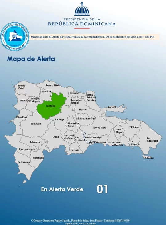 El COE mantiene 1 provincia en alerta verde, debido a que el informe del INDOMET, establece que un cielo de nubes dispersas se aprecia sobre gran parte de la geografía nacional, notándose la disminución de las precipitaciones, producto de la incidencia de una masa de aire menos húmeda por lo que solo