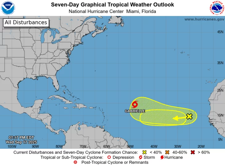 Tormenta tropical Gabrielle, localizado a unos 1595 kilómetros al este de las islas de Sotavento, Antillas Menores. Se mueve hacia el oeste a unos 22 kph. Con vientos máximos de unos 85 km/h.