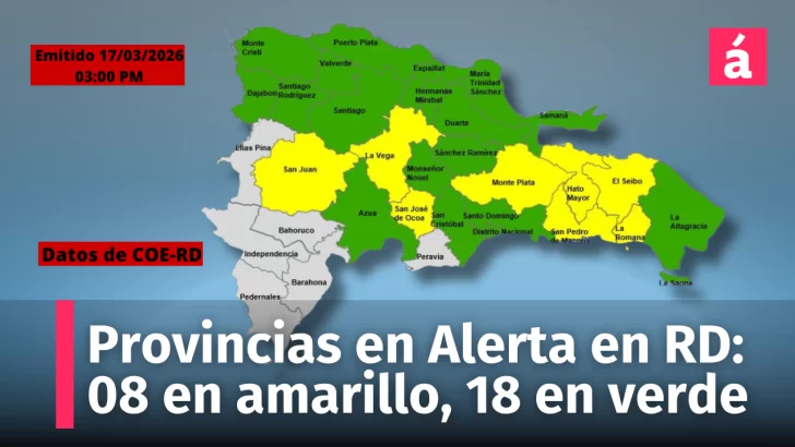 El escenario de riesgo sigue bajo vigilancia. Los niveles de alertas meteorológicas y avisos meteorológicos fueron modificados ante la posibilidad de inundaciones urbanas, crecidas de ríos, arroyos y cañadas, además de deslizamientos de tierra en zonas vulnerables. En este momento, las provincias bajo alerta incluyen Dajabón, Duarte, San Cristóbal, Espaillat, Azua, Santiago, Santiago Rodríguez, el Gran Santo Domingo y San Juan. Bajo aviso se mantienen Samaná, Valverde, La Altagracia, María Trinidad Sánchez, Sánchez Ramírez, El Seibo, Monseñor Nouel, Monte Plata, Puerto Plata, La Vega, Hermanas Mirabal y San José de Ocoa, entre otras.